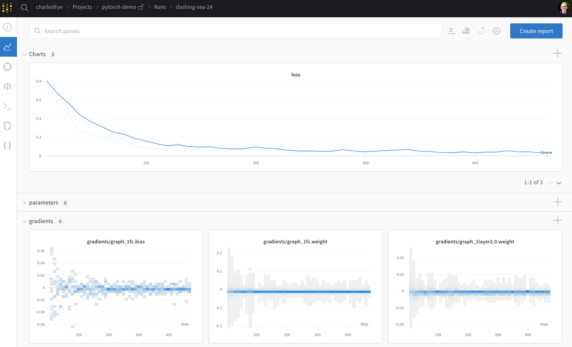 さて、全体のパイプラインを定義し、数行の W&B コードを追加したら、 完全に追跡された実験を実行する準備が整いました。 いくつかのリンクを報告します: ドキュメンテーション、 プロジェクトページ、これにはプロジェクトのすべての run が整理されています。 この run の結果が保存されるランページ。 ランページに移動して、これらのタブを確認:- Charts、トレーニング中にモデルの勾配、パラメーター値、損失がログされます